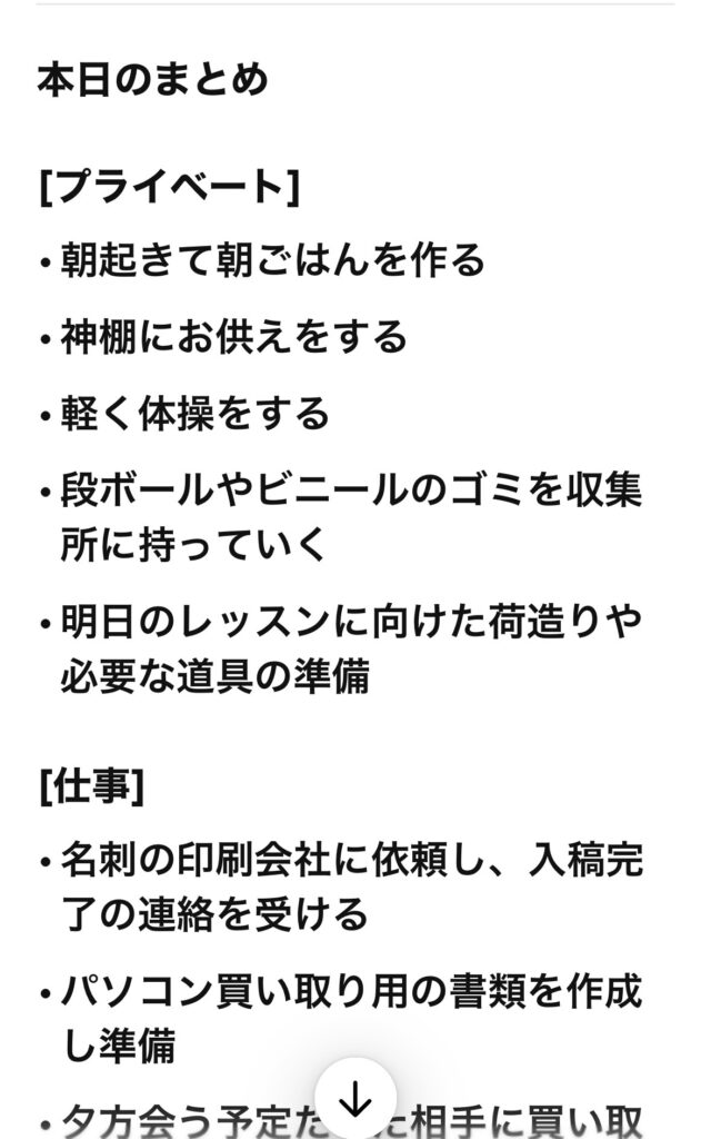 そこで、同じ車内で、今日朝起きてから今までの時間の間に取り組んだこと、行ったことを、のべつ幕無しに話していき、最後に「仕事とプライベートに分けて、箇条書きにまとめて」と依頼しました。